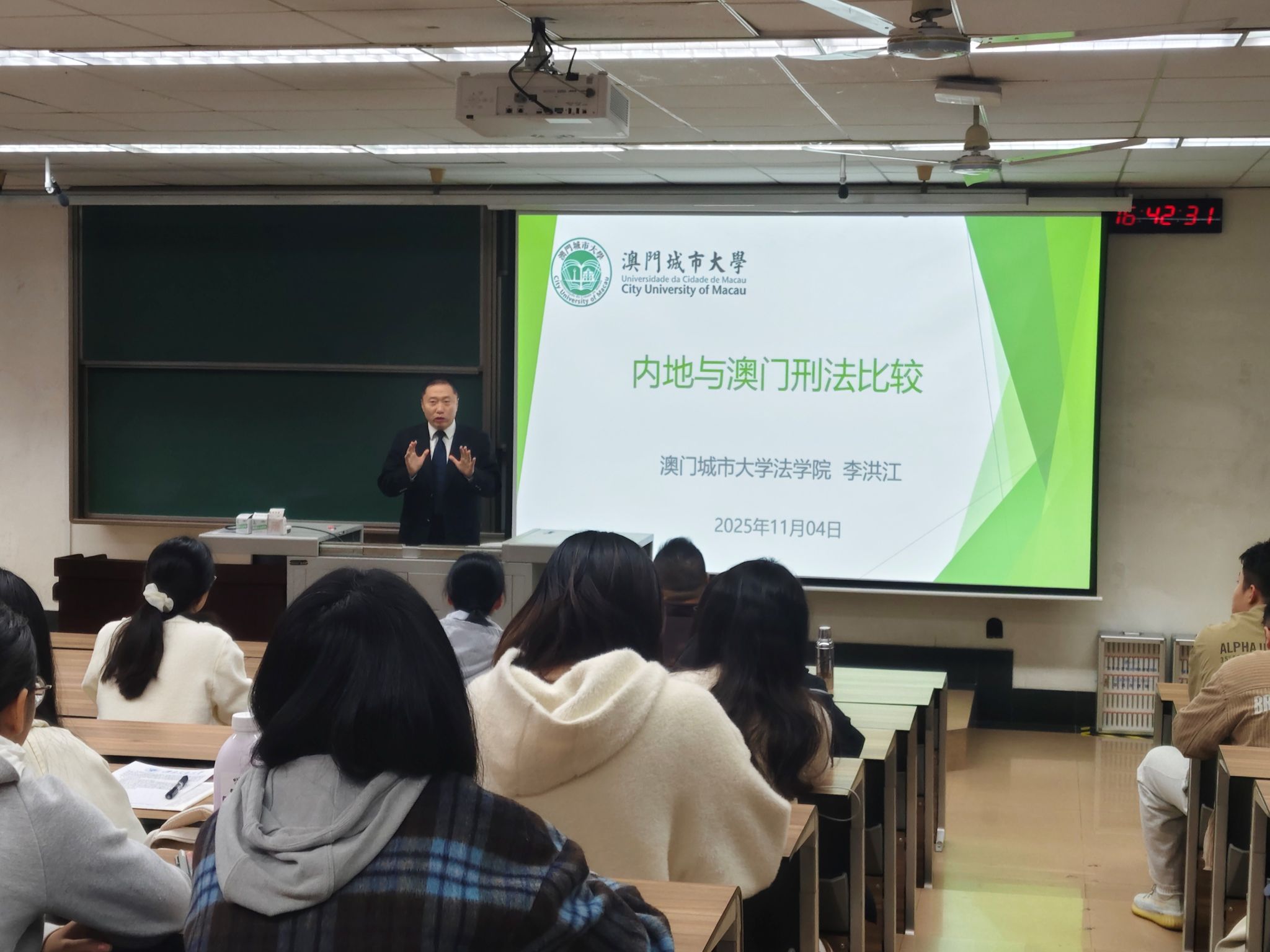 ,作题为“内地与澳门刑法比较”的专题讲座。李洪江副教授现任澳门城市大学校学术委员会委员、澳门城市大学校董会成员、澳门法律改革咨询委员会成员、澳门《法政杂志》主编、澳门金融法律协会副会长、广东省法学会粤港澳大湾区建设港澳法治人才库港澳专家,曾任最高人民法院法官等职。